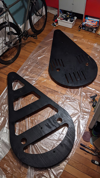 J'ai utilisé les plans du ROCKR PRO et pour la finition un vernis noir pour éviter les tâches de graisse de la transmission.