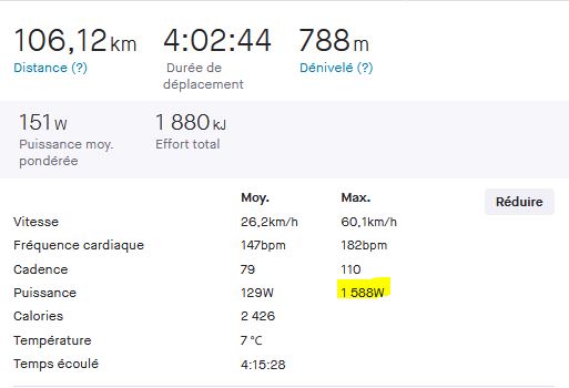 Par contre depuis que je roule avec une manivelle en 172.5 et l'autre en 175, je pense que ça fausse les résultats du capteur de puissance. Je m'explique début Janvier j'étais à 1000-1100watts maxi.