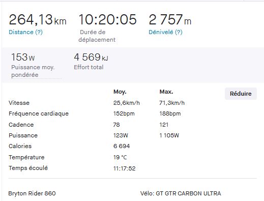 Toujours pas monté les gros plateaux sur le vélo mais Samedi ça aurait été appréciable. 100km vent de face puis ensuite 100km vent de dos rafales à 60 kmh :mrgreen: J'ai gagné 4 kmh en moyenne avec le retour où j'ai atteint des vitesses stratosphériques :lol: