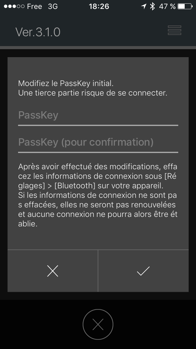 D'abord l'appli E-Tube merde tjrs au même moment, quand je tente de connecter mon capteur D-Fly (connecté auparavant dans les paramètres BT de mon iPhone 6s), et quitte inopinément sur cette deuxième page, je n'ai même pas le temps de rentrer le code par défaut qui est 000000 :